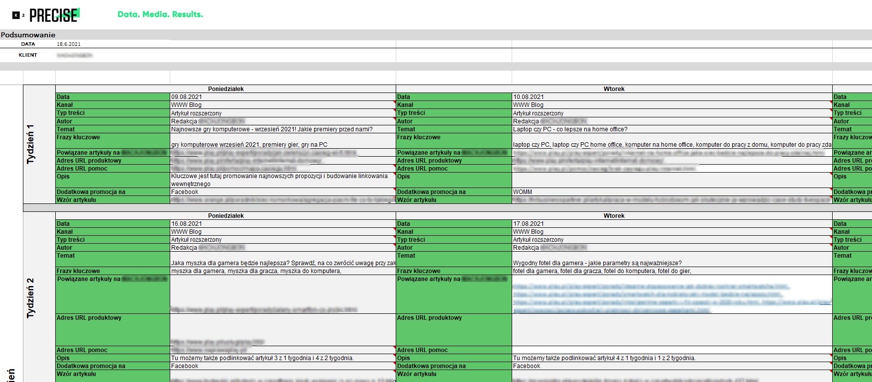 A skoro przy frazach jesteśmy – warto w tym momencie podkreślić, że tworzenie dobrego planu contentowego powinno angażować nie tylko dział zajmujący się konkretnie treścią, lecz także SEO. Z naszego doświadczenia wynika, że ścisła współpraca specjalistów z obu tych obszarów już na starcie daje przewagę – SEO-wiec wkłada swoją wiedzę z zakresu pozycjonowania, co m.in. pomaga znaleźć najwłaściwsze frazy, a contentowiec ubiera je w słowa, które dają ciekawe, merytoryczne i prawidłowe językowo treści. Przygotowywane są wtedy szczegółowe konspekty dla każdego artykułu, zawierające w sobie nie tylko frazę główną, frazy poboczne i temat, lecz także: nagłówki H2 i H3, które inaczej można określić śródtytułami, linkowania wewnętrzne, propozycje grafik z odpowiednim opisem ALT, meta tytuł, meta opis i inne.