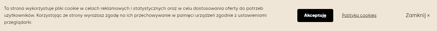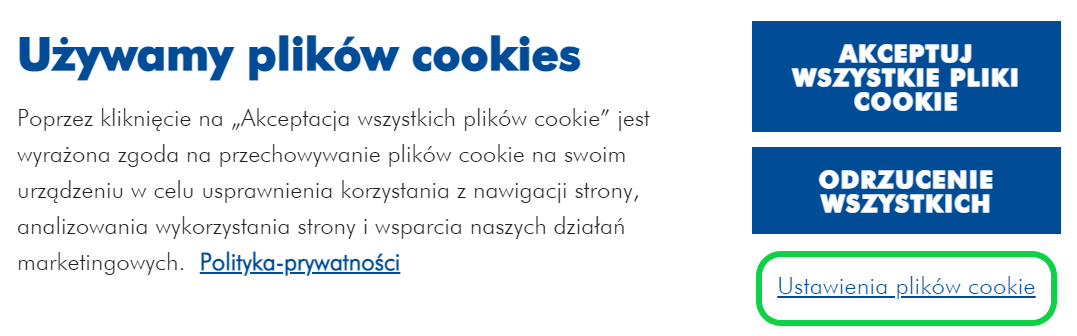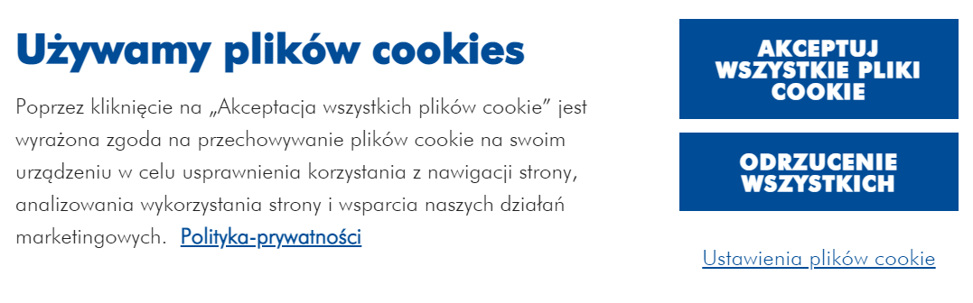 Taki baner informuje o tym, że strona korzysta z plików cookies, posiada link do podstrony poświęconej polityce prywatności oraz posiada wyraźnie oznaczony przycisk, który pozwala odwiedzającemu zaakceptować lub odrzucić wszystkie pliki cookies.