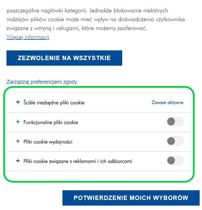 Kolejnym ważnym elementem jest przycisk przenoszący do strony, która mówi czym są pliki cookies i wskazuje na konkretne ich rodzaje, które są wykorzystywane na stronie oraz na których działanie możemy się zgodzić lub nie. Wszystkie te kategorie oprócz technicznych (niezbędnych) plików cookies są automatycznie odznaczone.