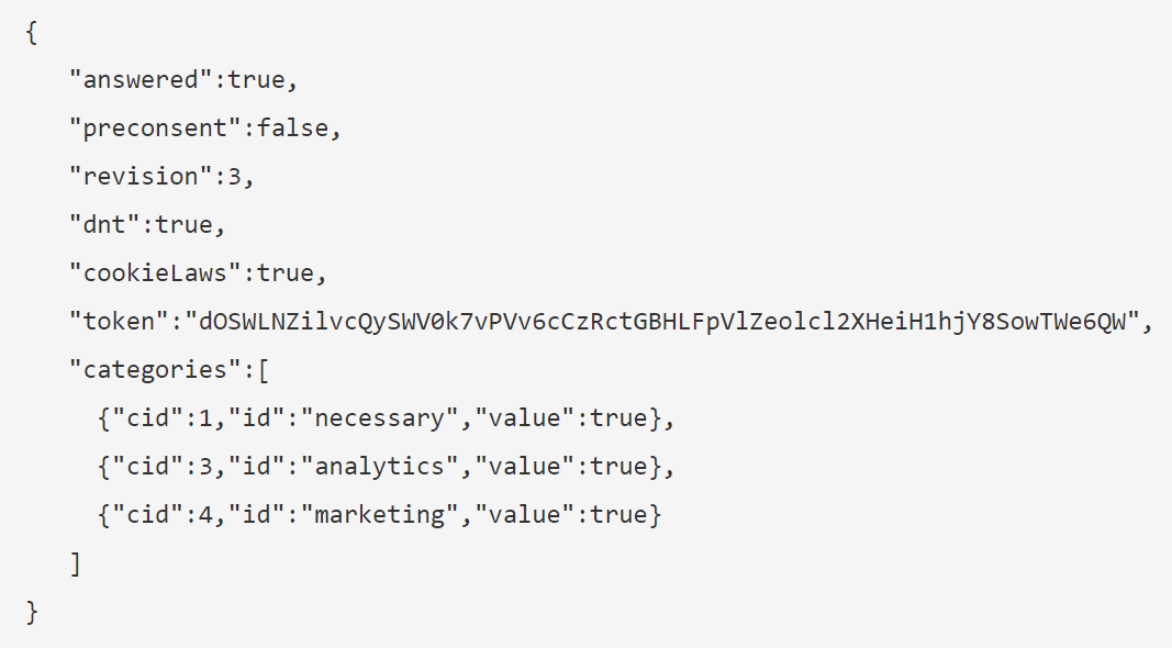 Taki obiekt zawiera między innymi unikatowy dla użytkownika token oraz informacje o tym, czy użytkownik dokonał decyzji odnośnie do cookies (patrz na „answered” na powyższym obrazku), na jakie kategorie ciasteczek się zgodził („categories” gdzie można zobaczyć, które kategorie nie są blokowane czyli posiadają „value” równe „true”) lub czy przeglądarka automatycznie blokuje działanie ciasteczek („dnt”).