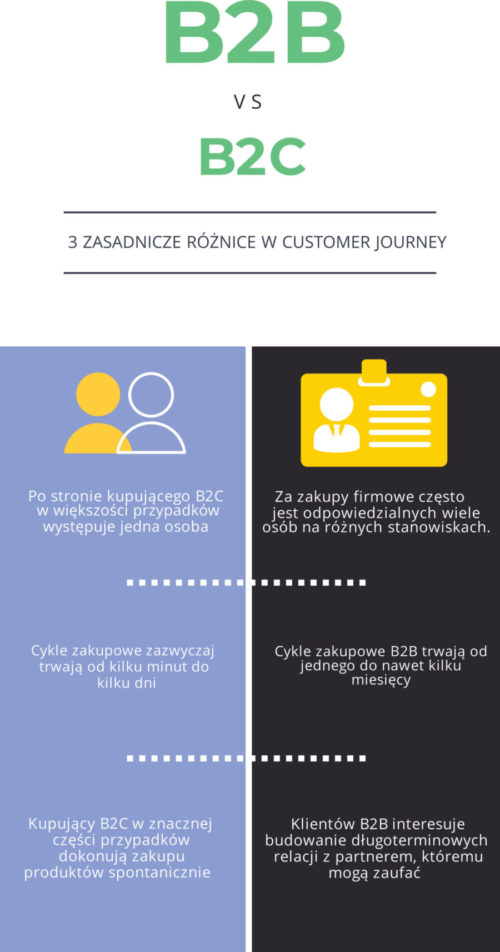 Różnice pomiędzy relacjami B2B i B2C mają bezpośredni wpływ na tworzenie map customer journey. Mapowanie podróży B2B jest bardziej złożone i wymaga zaawansowanych strategii SEO. Procesy takie jak transakcje, sprzedaż i przesyłanie wiadomości różnią się od siebie. Dlatego szczególnie ważne jest, aby marketerzy stosowali odpowiednią taktykę dla swoich klientów (zarówno firm, jak i konsumentów).