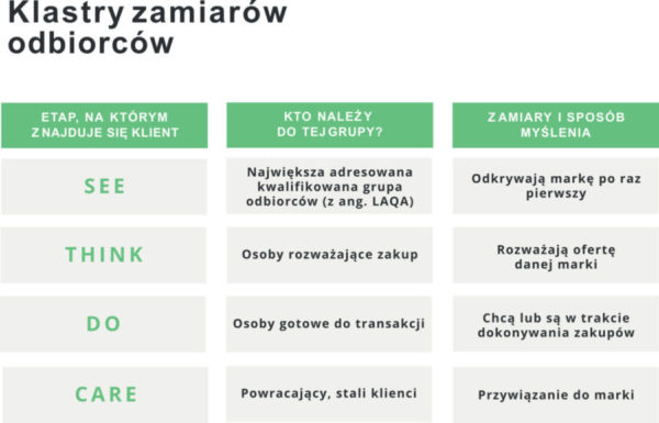 Model zaproponowany przez Kaushika skupiony jest głównie na użytkowniku, czyli na potencjalnym kliencie Twojej marki i bierze pod uwagę jego intencje, co bardzo mocno koresponduje z działaniami SEO i wytycznymi Google. W tym modelu użytkownicy podzieleni są na grupy ze względu na ich intencje zakupowe. Umożliwia to stworzenie efektywnej podróży klienta i odpowiednie zaplanowanie komunikacji oraz działań marketingowych, które będą odpowiadały potrzebom poszczególnych klientów.