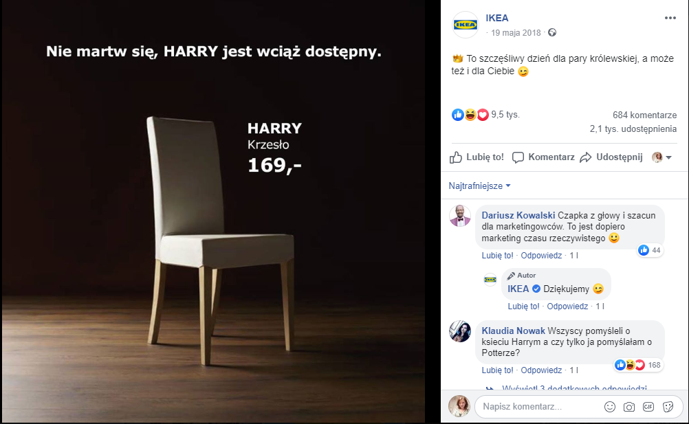 1. IKEA. Firma świetnie łączy produkty i ich nazwy z bieżącymi wydarzeniami. Poniżej reakcja na ślub księcia Harry’ego z Megan Markle.