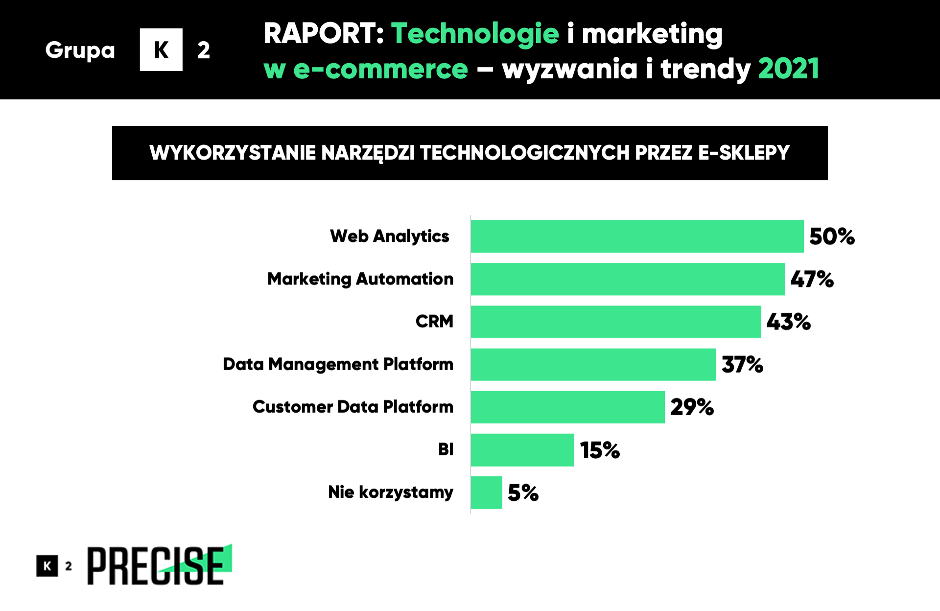 Zaawansowane rozwiązania technologiczne najczęściej wykorzystywane są przez sklepy internetowe w zarządzaniu relacjami z klientami przy pomocy CRM, dostarczaniu reklam, analityce, obsłudze mediów społecznościowych oraz wysyłce e-maili. Branża wykazuje też spore zainteresowanie narzędziami martech w obszarach: analityki zachowań klientów, raportowaniu, marketing automation (MA) i content marketing.