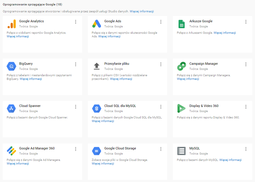 Tworząc raporty w Google Data Studio możemy importować dane z wielu źródeł w czasie rzeczywistym. Przede wszystkim możemy pobrać je z 18 czołowych narzędzi Google takich jak: Google Analytics, Google Search Console, Google Ads, Arkusze Google czy Youtube Analytics.