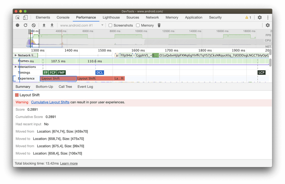 Tak przygotowane środowisko umożliwia wykonanie testu. W panelu Chrome DevTools, w zakładce Performance zaprezentowane zostaną wartości dla poszczególnych wskaźników Core Web Vitals. Na osi czasu zostaną one oznaczone odpowiednio jako LCP lub Layout Shift. Po kliknięciu w jeden z nich otrzymasz szczegółowe informacje o każdej z metryk.
