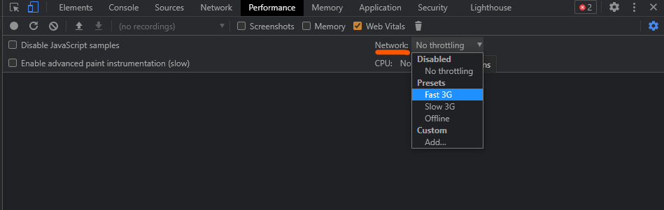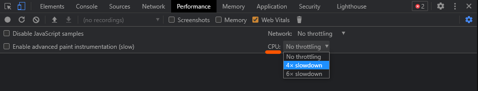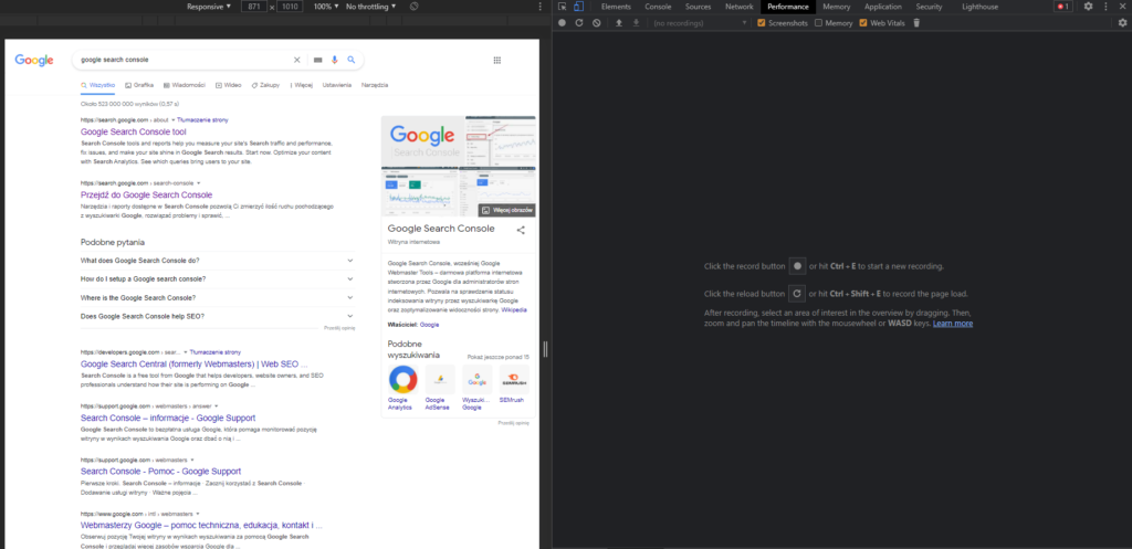 Jednocześnie dzięki konsoli Chrome możliwe jest przeprowadzenie testów wydajności witryny w kontrolowanym środowisku. Nowa sekcja panelu wydajności – „Performance”, pozwala zasymulować dowolne środowisko i zaobserwować, w jaki sposób kształtuje się w danych warunkach wydajność witryny. Można ustawić między innymi takie parametry jak: szybkość procesora, rozdzielczość ekranu oraz szybkość łącza. Jest to niezwykle przydatne do identyfikowania i naprawienia problemów z niestabilnością wizualną na stronie.