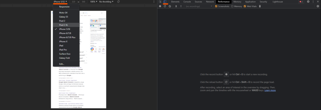 • za pomocą funkcji emulatora urządzeń wybrać rozdzielczość ekranu, dla którego przeprowadzony będzie test wydajności: