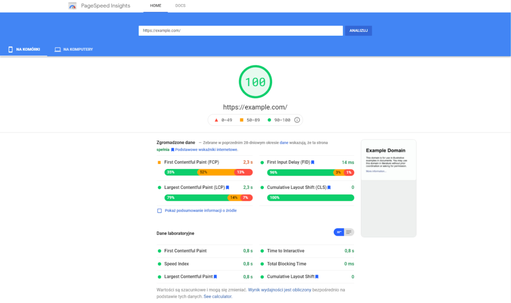 PageSpeed ​​Insights (PSI) to narzędzie, które działa w bardzo zbliżony sposób do Lighthouse. Za jego pomocą można zbadać dane terenowe dla dowolnego adresu URL, zarówno w wersji stacjonarnej, jak i mobilnej. Dzięki raportowi Chrome UX umożliwia zapoznanie się z informacjami o tym, w jaki sposób realni użytkownicy postrzegają Twoją stronę. PSI wykorzystuje również dane laboratoryjne, które importuje z Lighthouse (wyróżnione są niebieskim znacznikiem), a następnie na ich podstawie prezentuje zestaw praktycznych zaleceń, które jako właściciel witryny możesz wdrożyć, aby poprawić wrażenia użytkowników.
